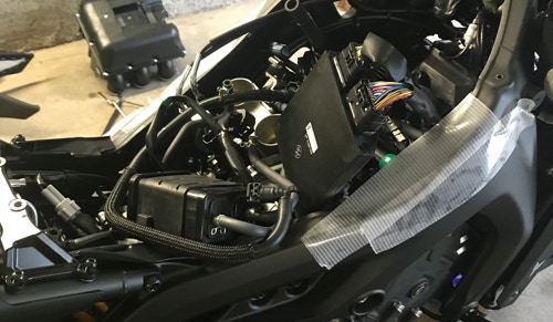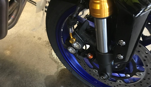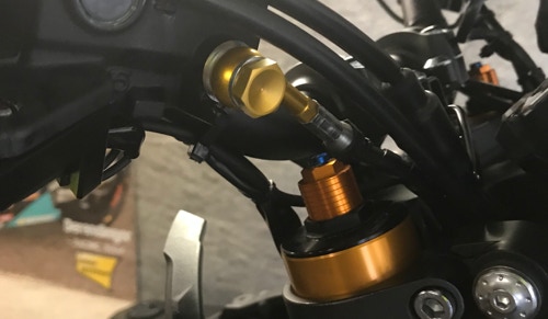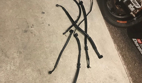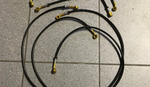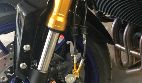 Über Sinn oder Unsinn kann man diskutieren aber ich finde Stahlflexleitungen sehen an diesem Bike nicht nur gut aus , sondern passen hervorragend auch zur Performance der MT-09SP und dem nun wirklich gutem Fahrwerk. Für diese Arbeit muss man schon ein wenig Fachkenntnis und auch gutes Werkzeug mitbringen. Zum einten ist das Verlegen nicht ganz unproblematisch und auch das Entlüften mit dem ABS ist etwas aufwändiger. Die Original Bremsleitungen vorne werden komplett mit allen Schläuchen ausgebaut. Denn die neuen Leitungen sind länger und ersetzen die Stahlleitungen, welche am ABS Modul wieder in Schläuchen enden. So ist kein Gummischlauch mehr vorhanden. Dadurch muss man aber gewährleisten, dass die neuen Leitungen nirgends am Rahmen scheuern. Dafür habe ich Gummitüllen mit innen 7 mm und aussen 15 mm angebracht, die als Distanzhalter fungieren. Hinten sind zwei neue Stahlflexleitungen an die Originalstahlleitungen angeschlossen. Diese muss aber fixiert werden. Dafür habe ich eine Klemmvorrichtung gemacht. nun halten die festen Leitungen sicher am Rahmen und die flexiblen können mit der Schwinge auf und ab schwenken, so oft sie wollen. Die Gummitüllen werden auch dort eingesetzt wo früher der dicke Schlauch durch eine Lasche befestigt wurde. Sonst hat es viel Luft zwischen Leitung und Ringaufnahme. Nachdem man die Bremsflüssigkeit abgelassen oder gesogen hat (Achtung Bremsflüssigkeit greift Lack an) ,kann man die Leitungen lösen. Man muss aber aufpassen, dass nicht Restflüssigkeit auf lackierte Teile austritt. Darum alles abdecken, was mit dem Zeug in Berührung kommen kann. Danach die neuen Leitungen an der richtigen Stelle anschrauben und immer neue Dichtringe verwenden. Die Aluhohlschrauben darf man nicht zu fest anziehen, da sie brechen könnten. Das Entlüften kann mit Vacuumpumpe innert wenigen Minuten durchgeführt werden. Der Bremsdruckpunkt ist bei meiner MT natürlich nicht um Welten besser, weil sie ja auch noch neue Bremsschläuche hatte. Aber wenn sowieso gewechselt wird, dann würde ich immer Stahlflex nachrüsten. Da Melvin auf Wunsch ein für die Schweiz wichtiges FAKT Dokument beilegt, sollte das Eintragen auf einer MFK kein Problem darstellen. Anbei ein paar Fotos.